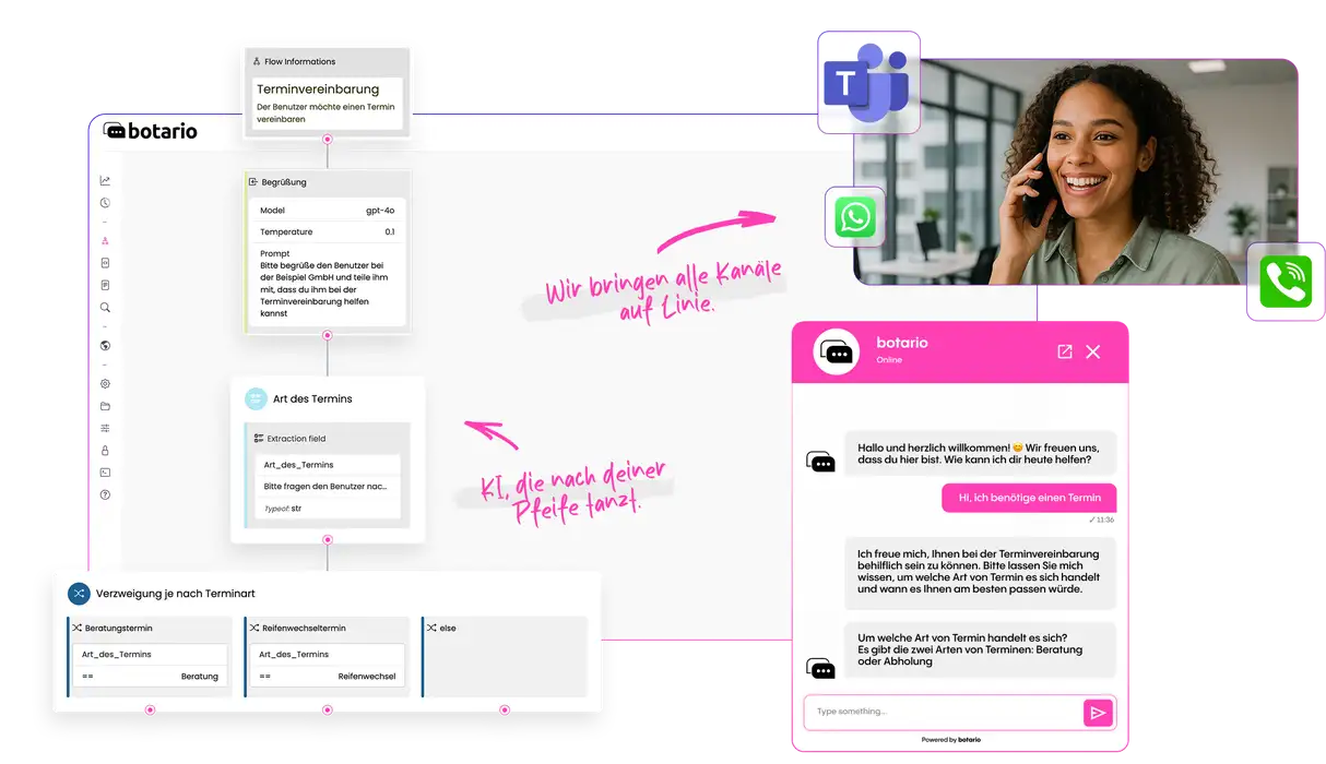 botario vereint Chatbot, Telefonbot und Livechat in einer KI-basierten Plattform – für effiziente Bearbeitung jeder Konversation, Automatisierung selbst der komplexesten Anwendungsfälle und konsistenten Service über alle Kanäle hinweg.