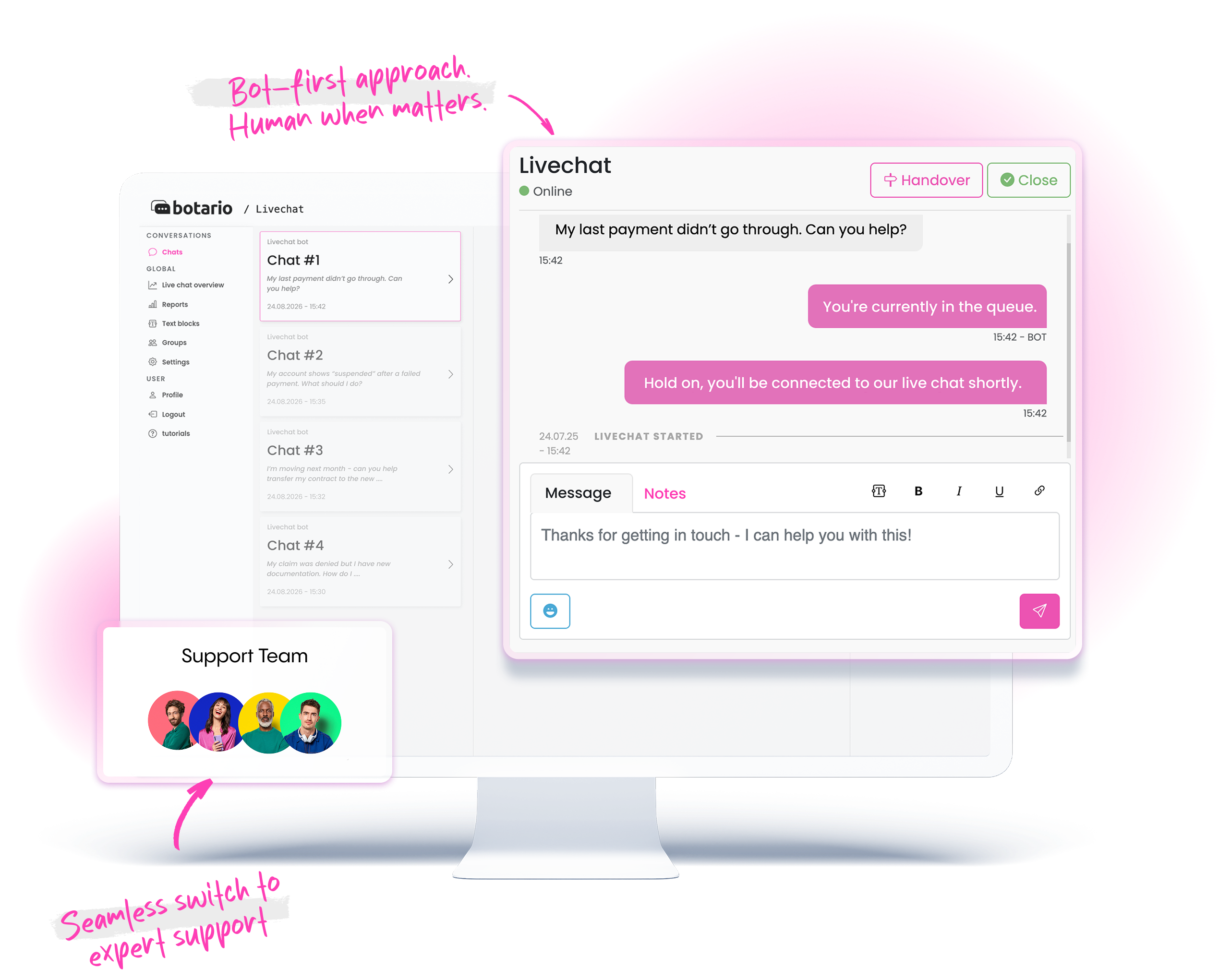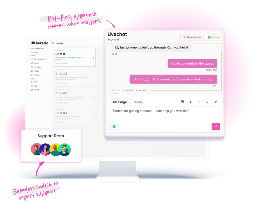 botario Live Chat brings all customer messages together — no matter the channel. Agents respond with full context, enabling faster resolutions, smoother handovers, and more professional service. Whether for support or sales, everything happens in one place, connected to the systems that power your business.